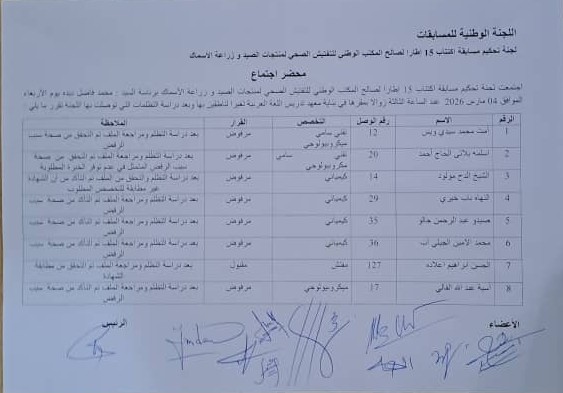 اجتمعت لجنة تحكيم مسابقة اكتتاب 15 إطارا لصالح المكتب الوطني للتفتيش الصحي برئاسة السيد : محمد فاضل ديده اليوم الأربعاء الموافق 04/03/2026 عند الساعة الثالثة بعد الظهر بمقرها في بناية معهد تدريس اللغة العربية لغير الناطقين بها.